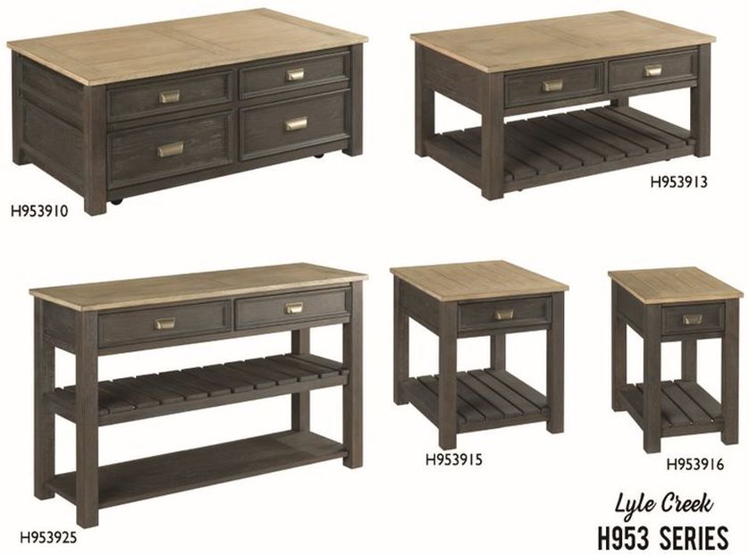 The Lyle Creek collection includes a small cocktail table, large cocktail table, end table, chairside table, and sofa table.Read More