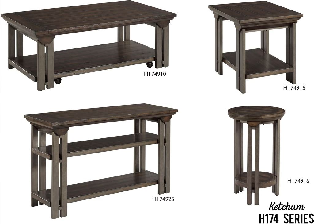 The Ketchum collection includes a rectangular cocktail table, rectangular end table, round chairside table, and sofa table.Read More