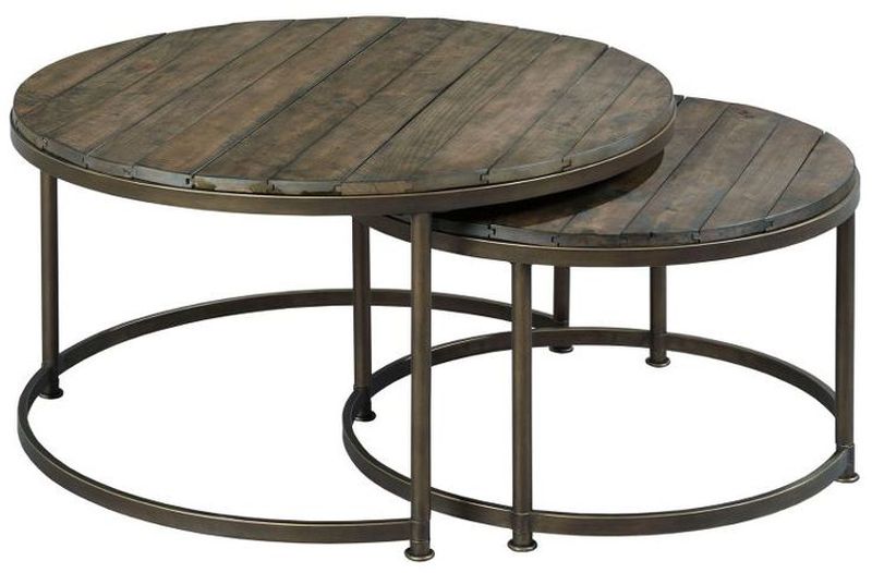 The Hammary® Leone Weathered Barn Round Nesting Cocktail Table Set with Antique Brass Base is crafted of square and round metal tubing and tongue and grooved solid plank tops. Metal is antique brass and tops are weathered barn finish with worm holes and distressing. Leone follows today’s trend of clean lines and features an open space with an airy feel.Read More