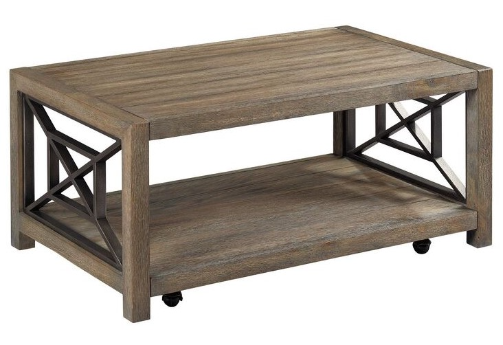 Smaller coffee table sized for small spaces that has metal fretwork in the ends with an aged wood shelf for storage. Graceful, transitional styling creates a very unique, sophisticated look. Castered for ease of movement and finished in an aged oak barrel color.Read More