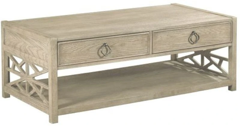 From the soft gray tones of the finish to the natural character of the oak wood grain each piece helps transform the home into a relaxed state of mind. Coffee table with geometric grids in the ends, drawers and shelf storage makes this casual beautiful table a conversation piece.Read More
