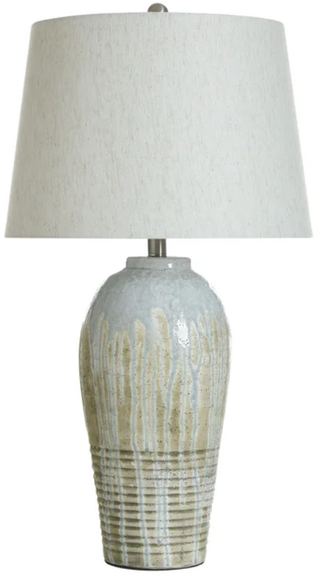 Stylecraft table lamp with hand-applied fired finish features a warm green base with unique, artisanal surface texture and a neutral fabric shade, creating soft ambient light while adding handcrafted character and timeless style to any living room, bedroom, or entryway.Read More